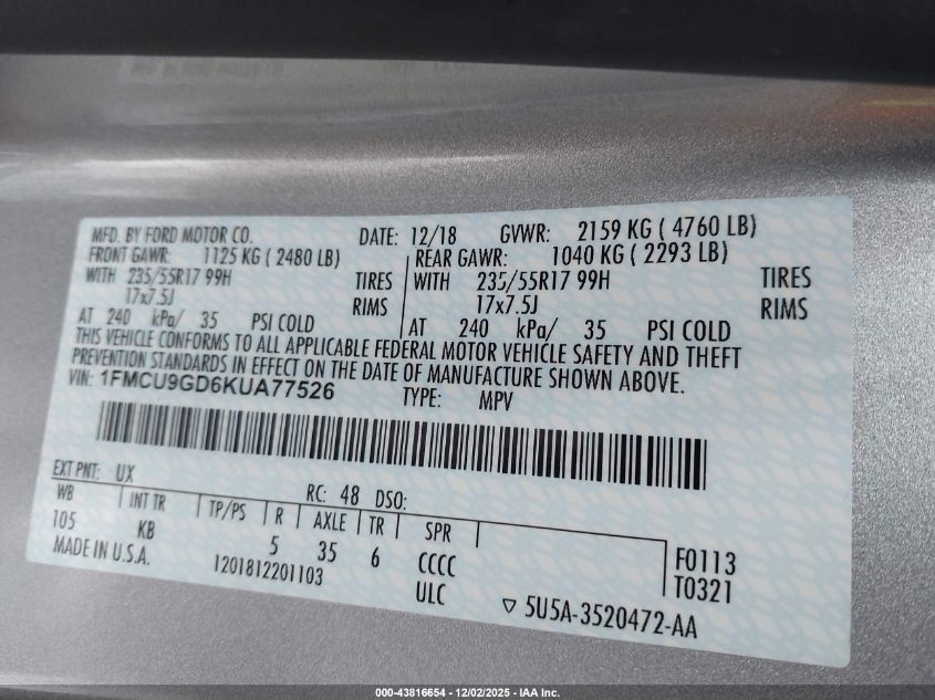 Цвет СеребряныйЦилиндры 4Привод Полный приводVIN 1FMCU9GD6KUA77526Состояние Заводится и едет (проверено)Повреждения Передняя или задняя AutoRIA