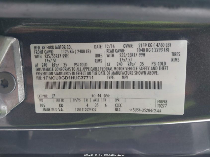 Цвет СерыйЦилиндры 4Привод Полный приводVIN 1FMCU9GD1HUC37711Состояние Заводится и едет (проверено)Повреждения Передняя или задняя AutoRIA