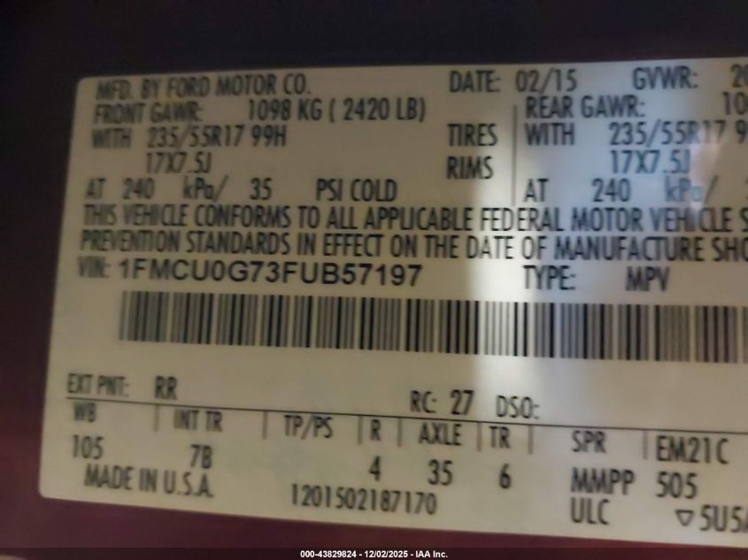 Цвет БордовыйЦилиндры 4Привод Передний приводVIN 1FMCU0G73FUB57197Состояние Заводится и едет (проверено)Повреждения Правая сторона AutoRIA