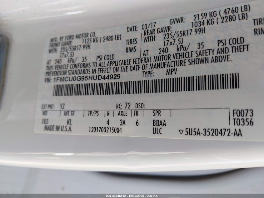 2017 FORD ESCAPE 2017 року Бензин, 2.0, Передний привод, vin - 1FMCU0G95HUD44929 из США