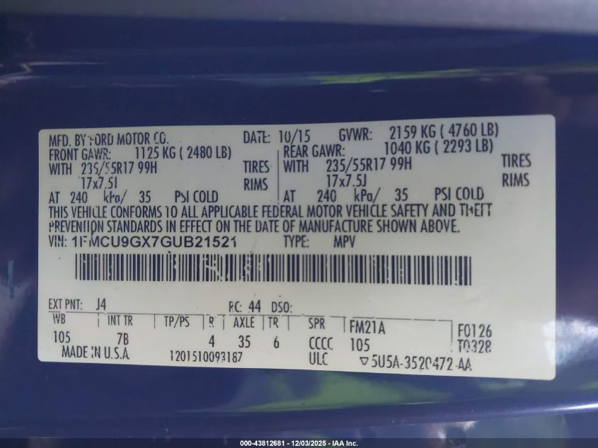 2016 FORD ESCAPE 2016 року Бензин, 1.6, Полный привод, vin - 1FMCU9GX7GUB21521 из США