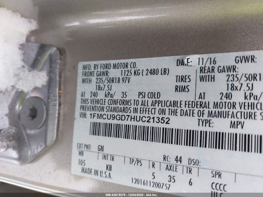 2017 FORD ESCAPE 2017 року Бензин, 1.5, Полный привод, vin - 1FMCU9GD7HUC21352 из США