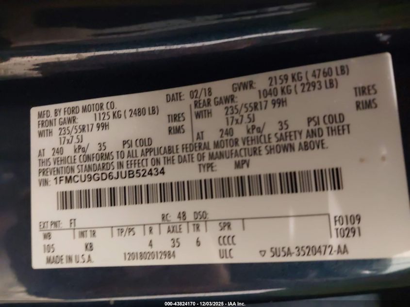 2018 FORD ESCAPE 2018 року Бензин, 1.5, Полный привод, vin - 1FMCU9GD6JUB52434 из США