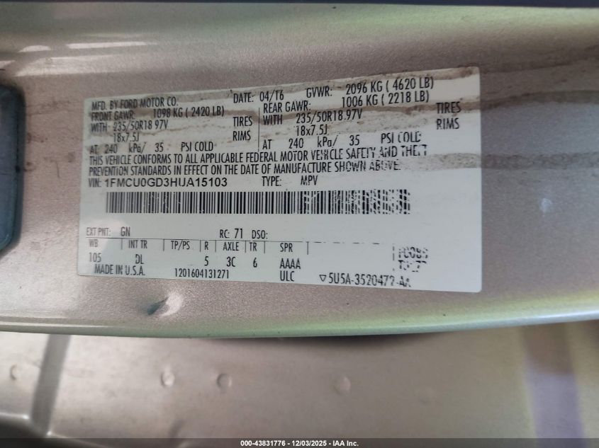 2017 FORD ESCAPE 2017 року Бензин, 1.5, Передний привод, vin - 1FMCU0GD3HUA15103 из США