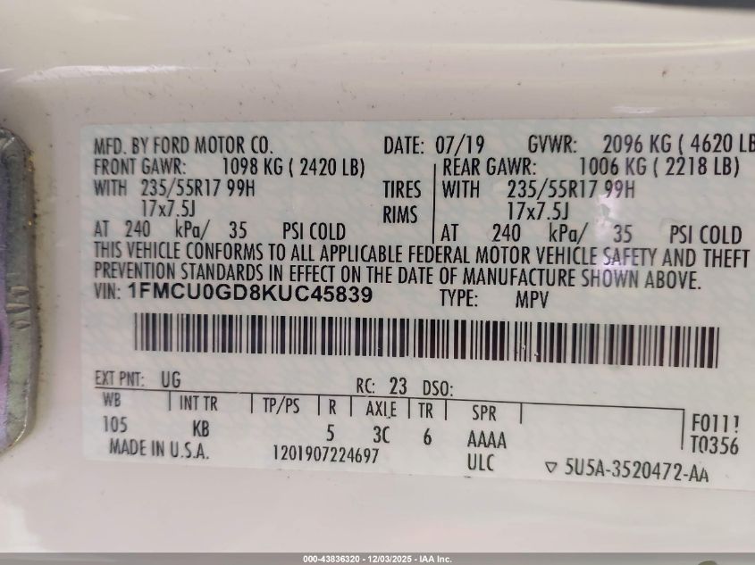 Цвет БелыйЦилиндры 4Привод Передний приводVIN 1FMCU0GD8KUC45839Состояние Заводится и едет (проверено)Повреждения Передняя или задняя AutoRIA