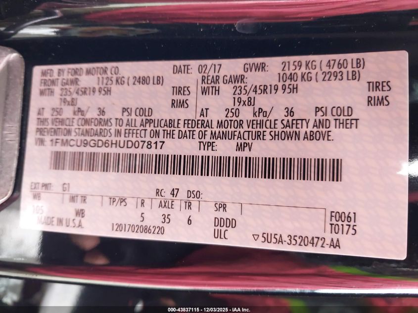 2017 FORD ESCAPE 2017 року Бензин, 1.5, Полный привод, vin - 1FMCU9GD6HUD07817 из США
