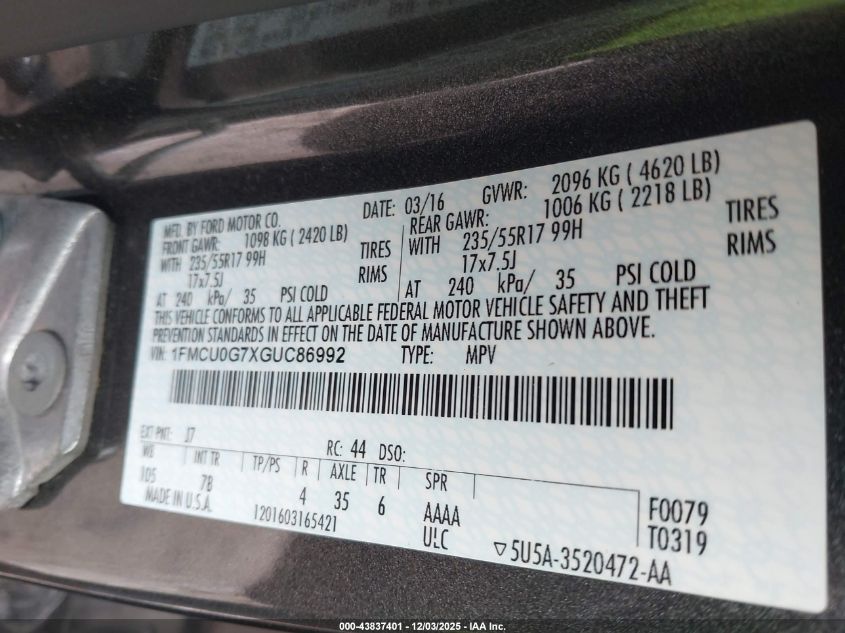 Цвет СерыйЦилиндры 4Привод Передний приводVIN 1FMCU0G7XGUC86992Состояние Заводится и едет (проверено)Повреждения Передняя или задняя AutoRIA