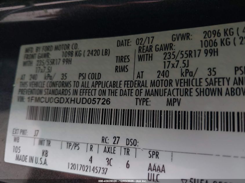 2017 FORD ESCAPE 2017 року Бензин, 1.5, Передний привод, vin - 1FMCU0GDXHUD05726 из США