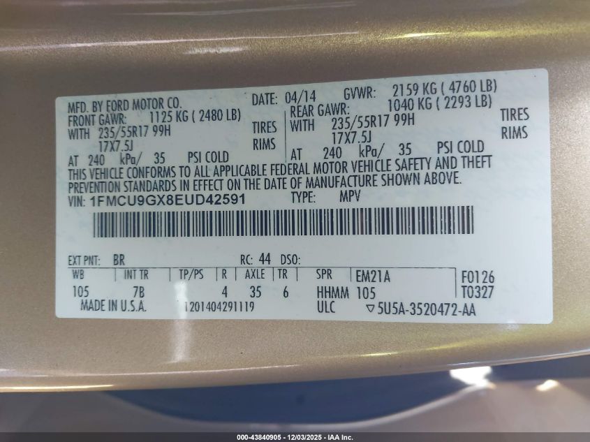 Цвет ЗолотойЦилиндры 4Привод Полный приводVIN 1FMCU9GX8EUD42591Состояние Заводится и едет (проверено)Повреждения Передняя или задняя AutoRIA