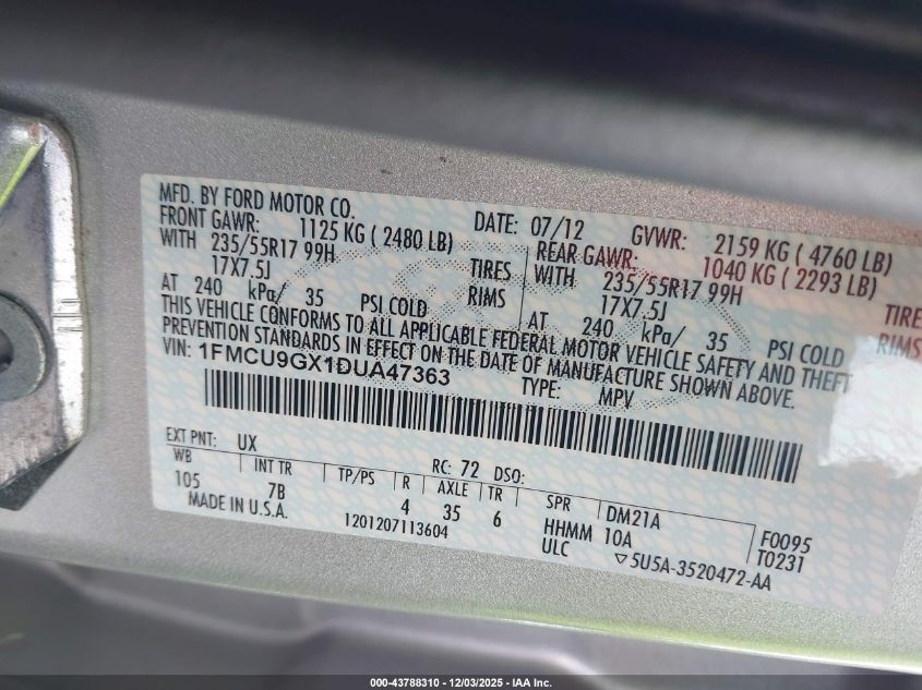 Цвет СеребряныйЦилиндры 4Привод Полный приводVIN 1FMCU9GX1DUA47363Состояние Заводится и едет (проверено)Повреждения Задняя AutoRIA