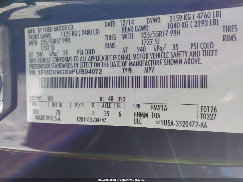 2015 FORD ESCAPE 2015 року Бензин, 1.6, Полный привод, vin - 1FMCU9GX9FUB04072 из США