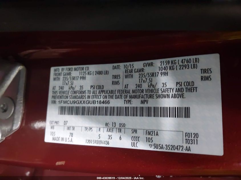 2016 FORD ESCAPE 2016 року Бензин, 1.6, Полный привод, vin - 1FMCU9GXXGUB18466 из США