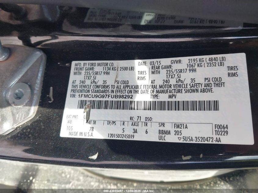 2015 FORD ESCAPE 2015 року Бензин, 2.0, Полный привод, vin - 1FMCU9G97FUB98292 из США