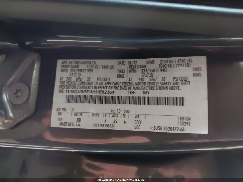 2017 FORD ESCAPE 2017 року Бензин, 1.5, Полный привод, vin - 1FMCU9GD3HUE82364 из США