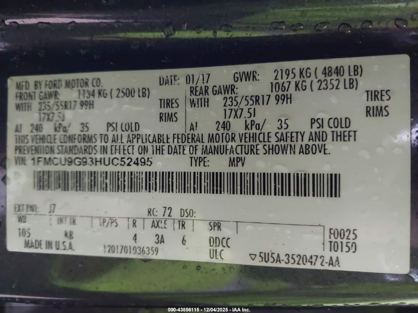 Цвет СерыйЦилиндры 4Привод Полный приводVIN 1FMCU9G93HUC52495Состояние СтационарноПовреждения Передняя или задняя AutoRIA
