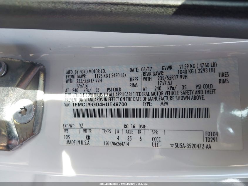 Цвет БелыйЦилиндры 4Привод Полный приводVIN 1FMCU9GD4HUE49700Состояние Заводится и едет (проверено)Повреждения Передняя или задняя AutoRIA