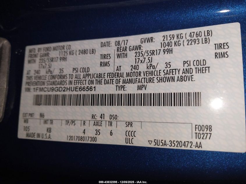 2017 FORD ESCAPE 2017 року Бензин, 1.5, Полный привод, vin - 1FMCU9GD2HUE66561 из США