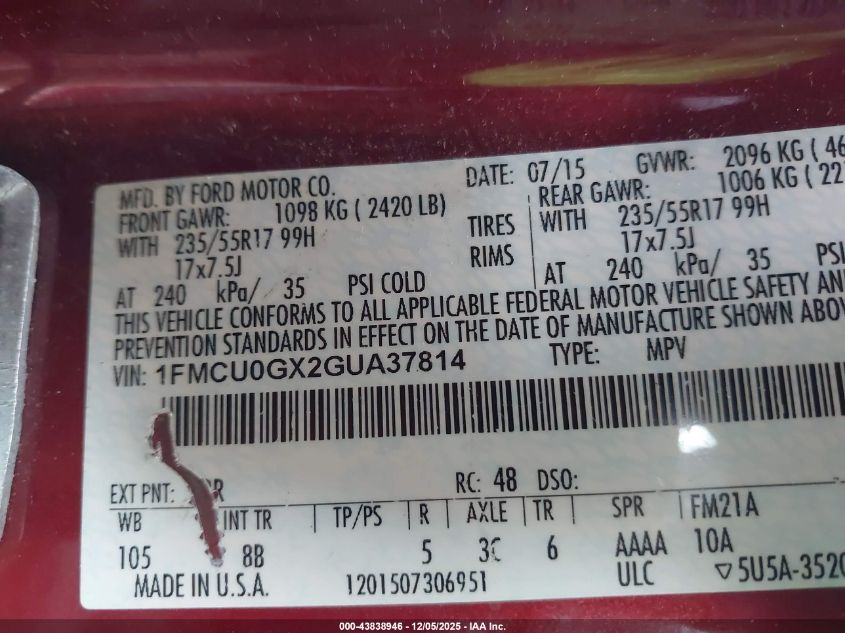 2016 FORD ESCAPE 2016 року Бензин, 1.6, Передний привод, vin - 1FMCU0GX2GUA37814 из США