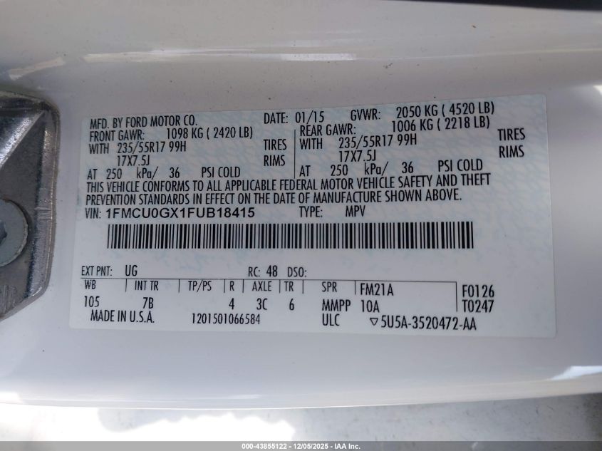 Цвет БелыйЦилиндры 4Привод Передний приводVIN 1FMCU0GX1FUB18415Состояние СтационарноПовреждения Передняя левая AutoRIA