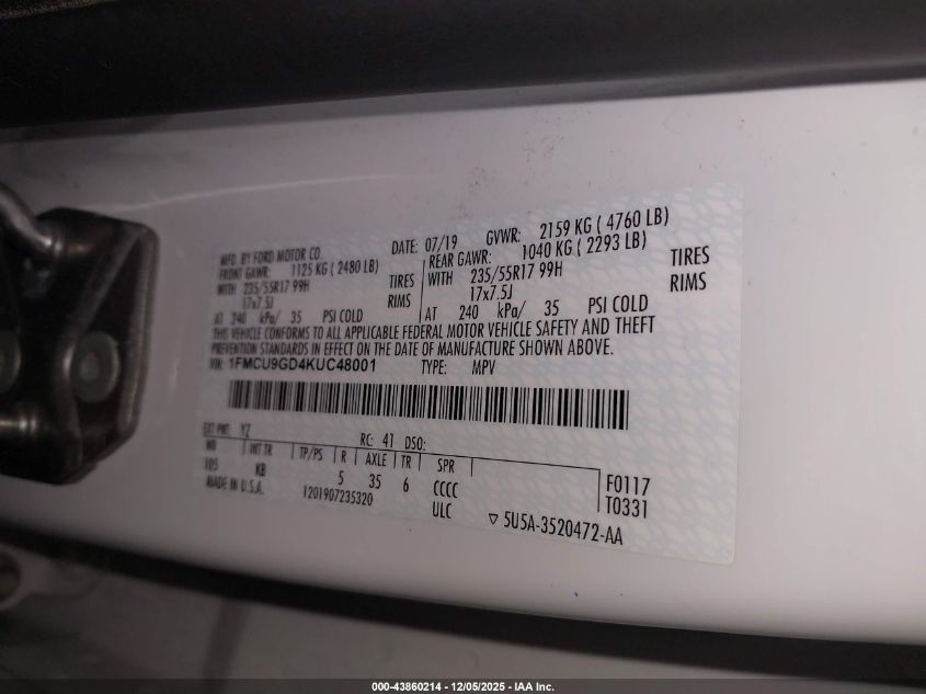 2019 FORD ESCAPE 2019 року Бензин, 1.5, Полный привод, vin - 1FMCU9GD4KUC48001 из США