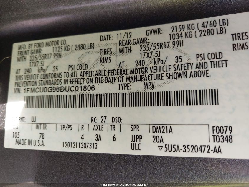Цвет СерыйЦилиндры 4Привод Передний приводVIN 1FMCU0G96DUC01806Состояние СтационарноПовреждения Задняя правая AutoRIA