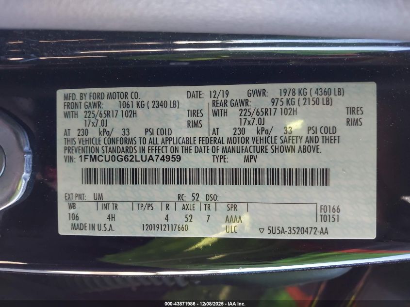 2020 FORD ESCAPE 2020 року Бензин, 1.5, Передний привод, vin - 1FMCU0G62LUA74959 из США