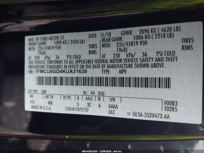 Цвет ЧерныйЦилиндры 4Привод Передний приводVIN 1FMCU0GD4KUA31639Состояние Заводится и едет (проверено)Повреждения Передняя правая AutoRIA