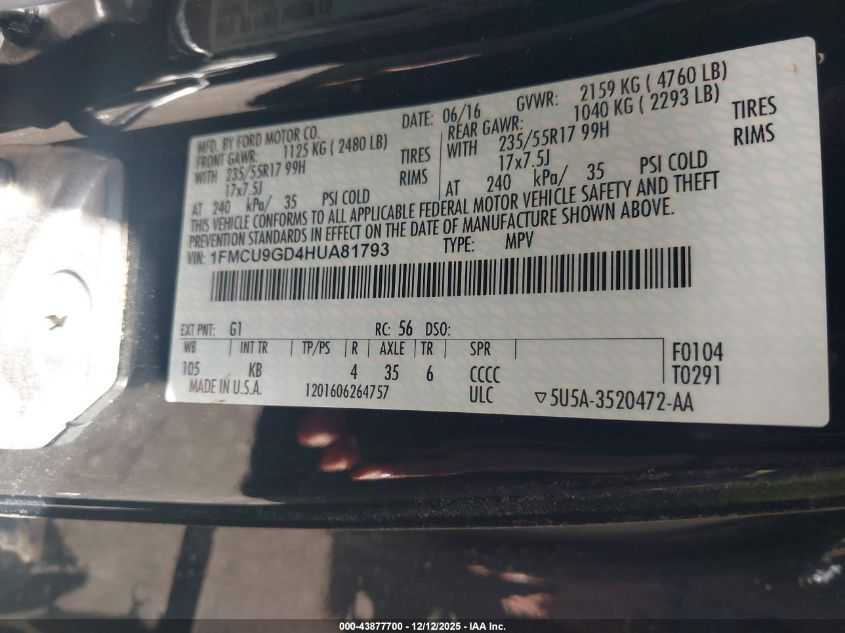 2017 FORD ESCAPE 2017 року Бензин, 1.5, Полный привод, vin - 1FMCU9GD4HUA81793 из США