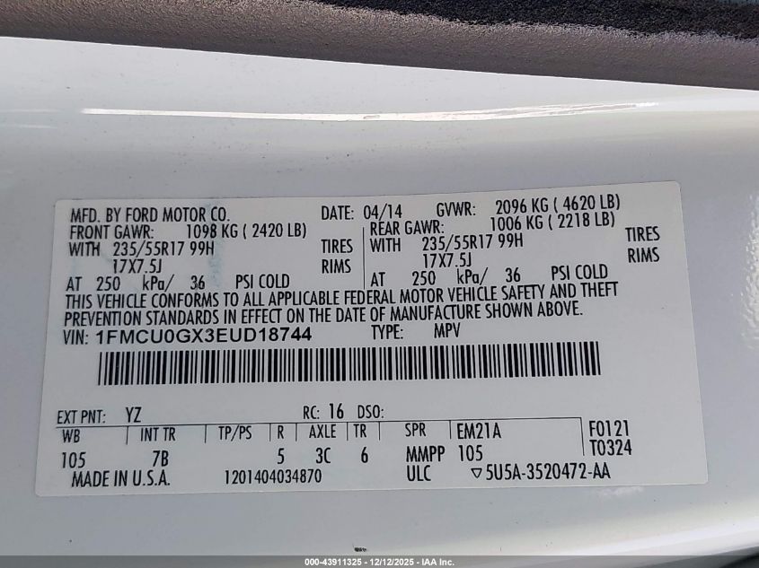 Цвет БелыйЦилиндры 4Привод Передний приводVIN 1FMCU0GX3EUD18744Состояние ЗаводитсяПовреждения Передняя или задняя AutoRIA