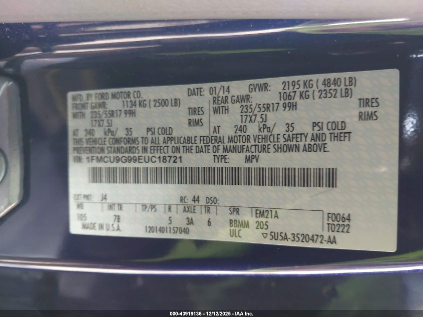 2014 FORD ESCAPE 2014 року Бензин, 2.0, Полный привод, vin - 1FMCU9G99EUC18721 из США