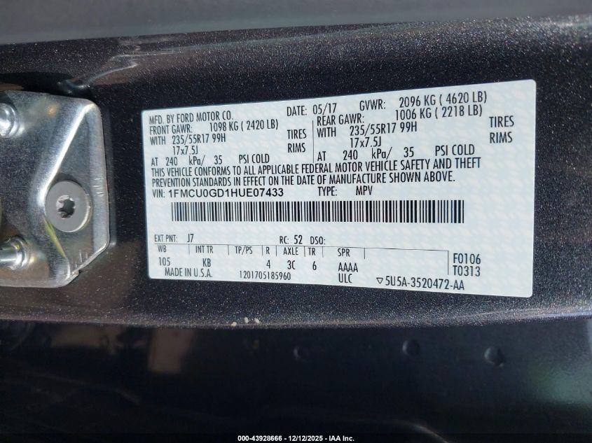 2017 FORD ESCAPE 2017 року Бензин, 1.5, Передний привод, vin - 1FMCU0GD1HUE07433 из США