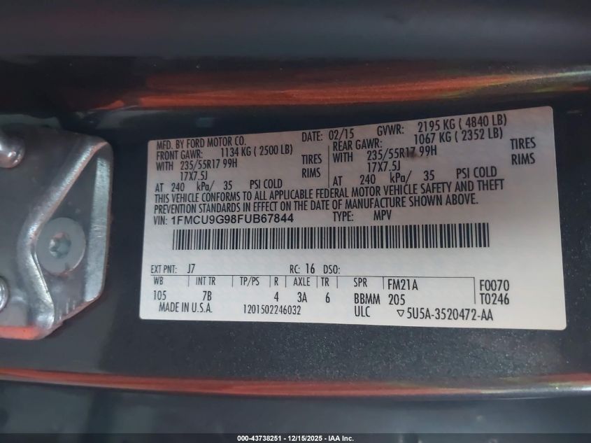 2015 FORD ESCAPE 2015 року Бензин, 2.0, Полный привод, vin - 1FMCU9G98FUB67844 из США