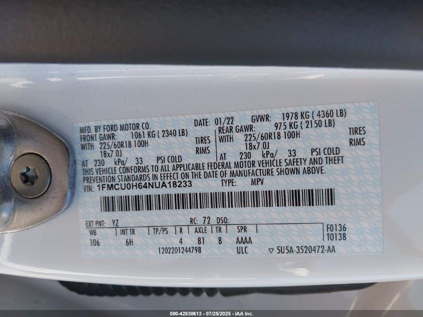 Цвет БелыйЦилиндры 3Привод Передний приводVIN 1FMCU0H64NUA18233Состояние СтационарноПовреждения Задняя AutoRIA
