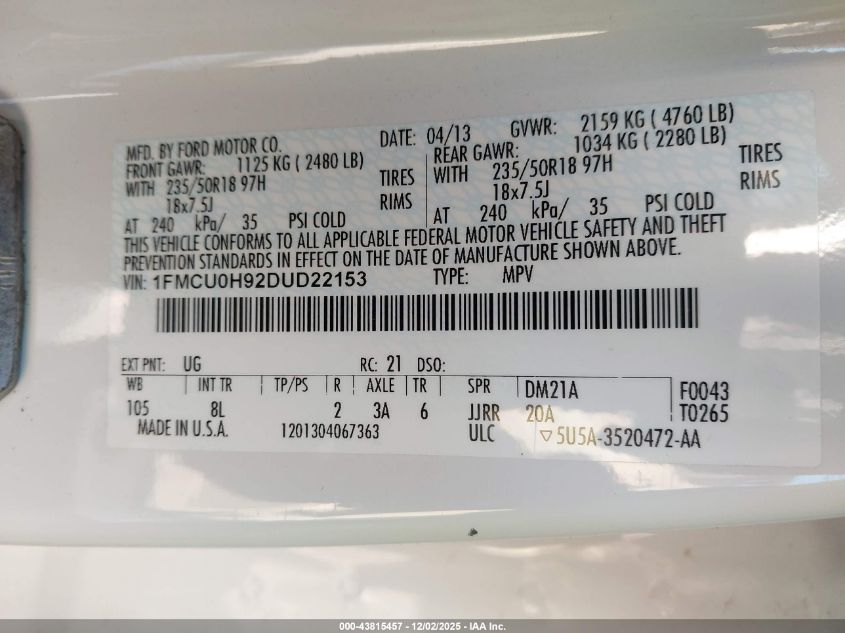 Цвет БелыйЦилиндры 4Привод Передний приводVIN 1FMCU0H92DUD22153Состояние Заводится и едет (проверено)Повреждения Задняя левая AutoRIA