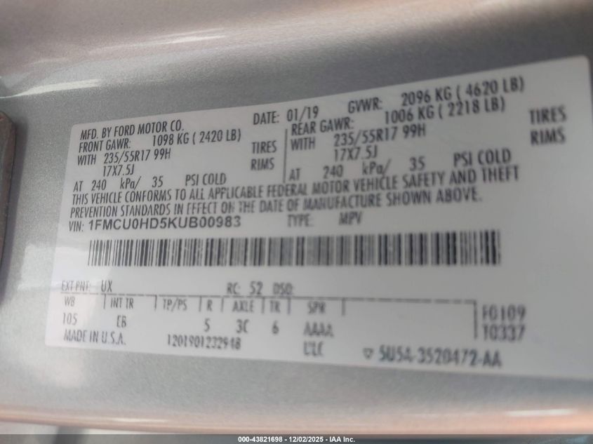 2019 FORD ESCAPE 2019 року Бензин, 1.5, Передний привод, vin - 1FMCU0HD5KUB00983 из США