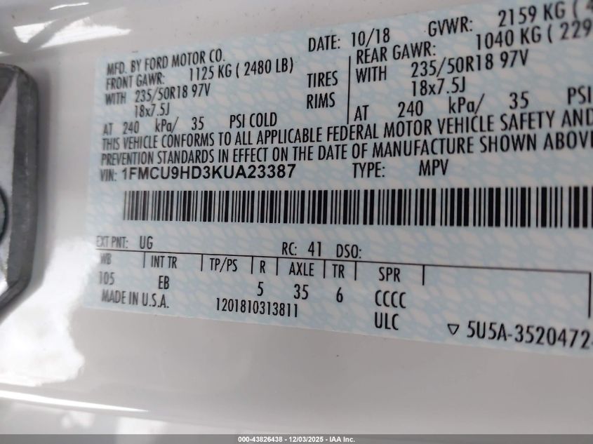 2019 FORD ESCAPE 2019 року Бензин, 1.5, Полный привод, vin - 1FMCU9HD3KUA23387 из США