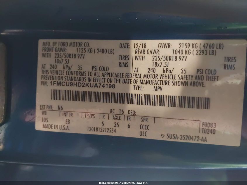 Цвет СинийЦилиндры 4Привод Полный приводVIN 1FMCU9HD2KUA74198Состояние СтационарноПовреждения Опрокидывание AutoRIA