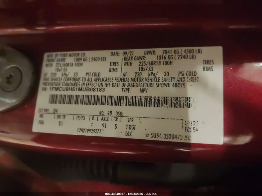 2021 FORD ESCAPE 2021 року Бензин, 1.5, Полный привод, vin - 1FMCU9H61MUB08183 из США