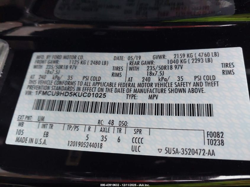 2019 FORD ESCAPE 2019 року Бензин, 1.5, Полный привод, vin - 1FMCU9HD5KUC01025 из США