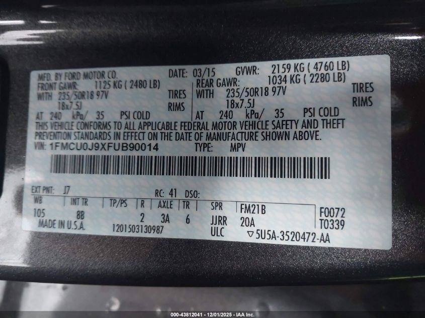 2015 FORD ESCAPE 2015 року Бензин, 2.0, Передний привод, vin - 1FMCU0J9XFUB90014 из США