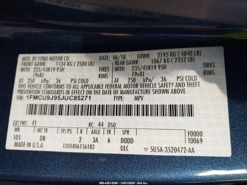 2018 FORD ESCAPE 2018 року Бензин, 2.0, Полный привод, vin - 1FMCU9J95JUC85271 из США