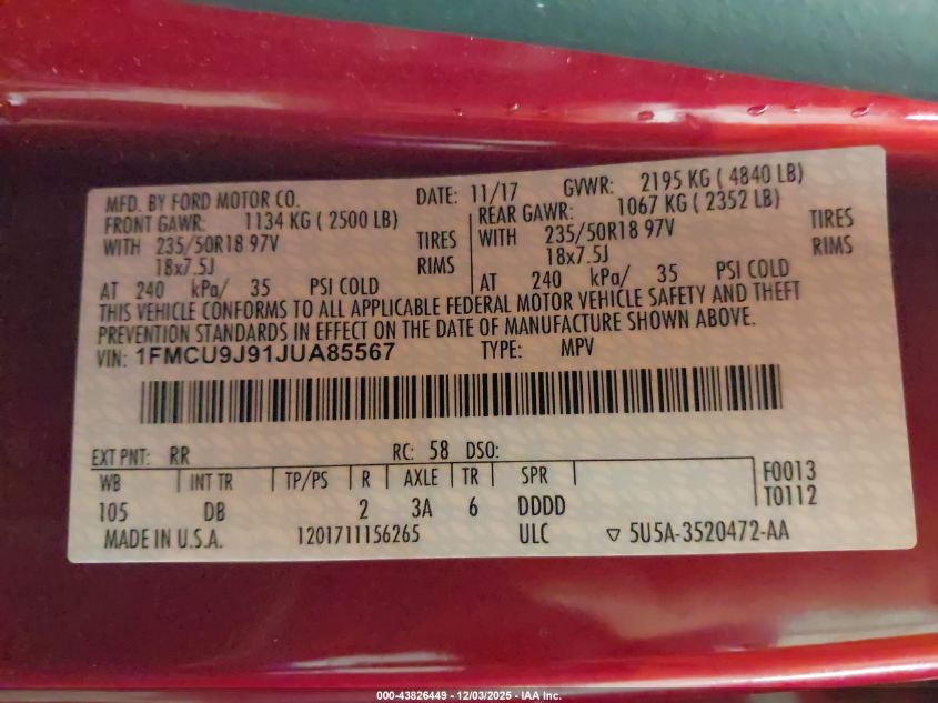 2018 FORD ESCAPE 2018 року Бензин, 2.0, Полный привод, vin - 1FMCU9J91JUA85567 из США