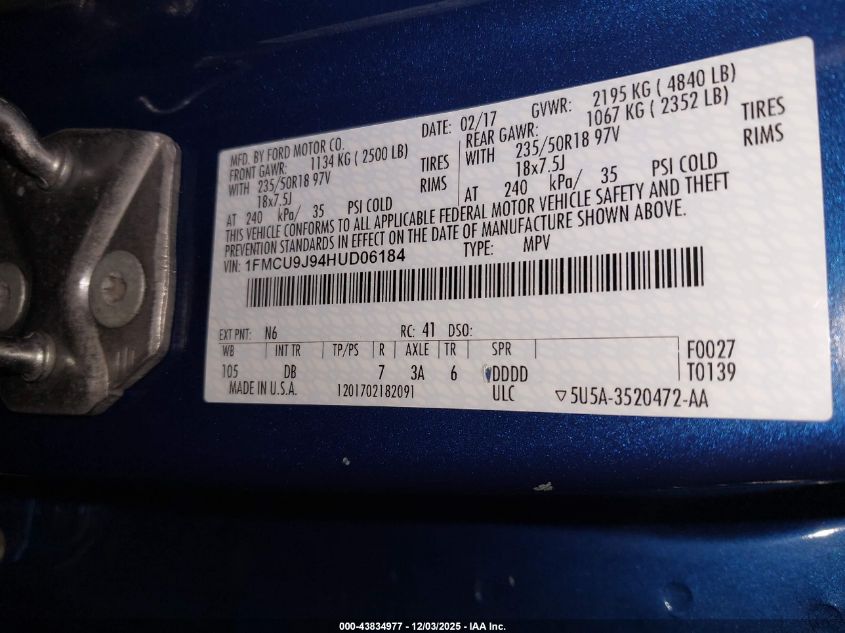 2017 FORD ESCAPE 2017 року Бензин, 2.0, Полный привод, vin - 1FMCU9J94HUD06184 из США