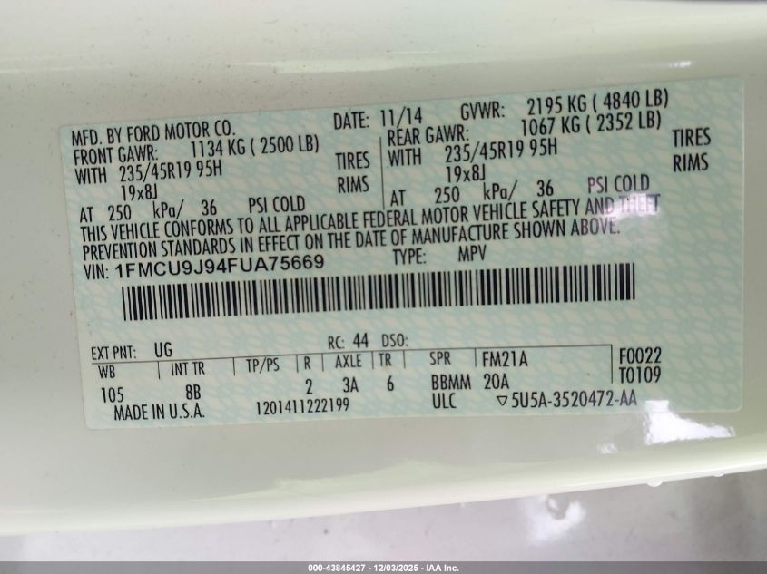 2015 FORD ESCAPE 2015 року Бензин, 2.0, Полный привод, vin - 1FMCU9J94FUA75669 из США