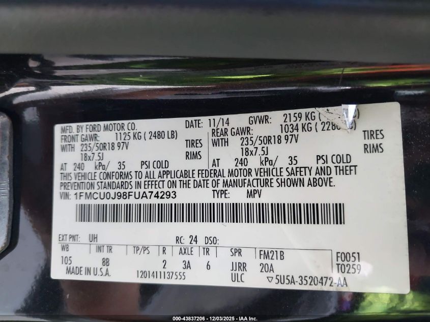 2015 FORD ESCAPE 2015 року Бензин, 2.0, Передний привод, vin - 1FMCU0J98FUA74293 из США