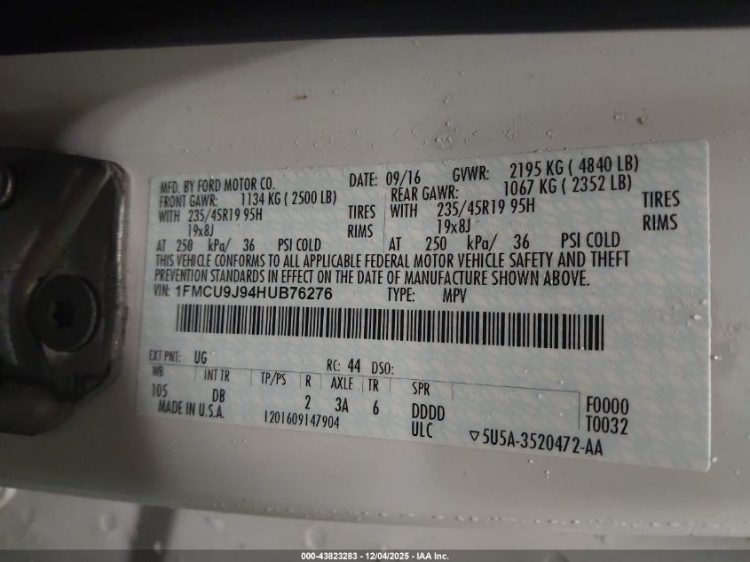 2017 FORD ESCAPE 2017 року Бензин, 2.0, Полный привод, vin - 1FMCU9J94HUB76276 из США