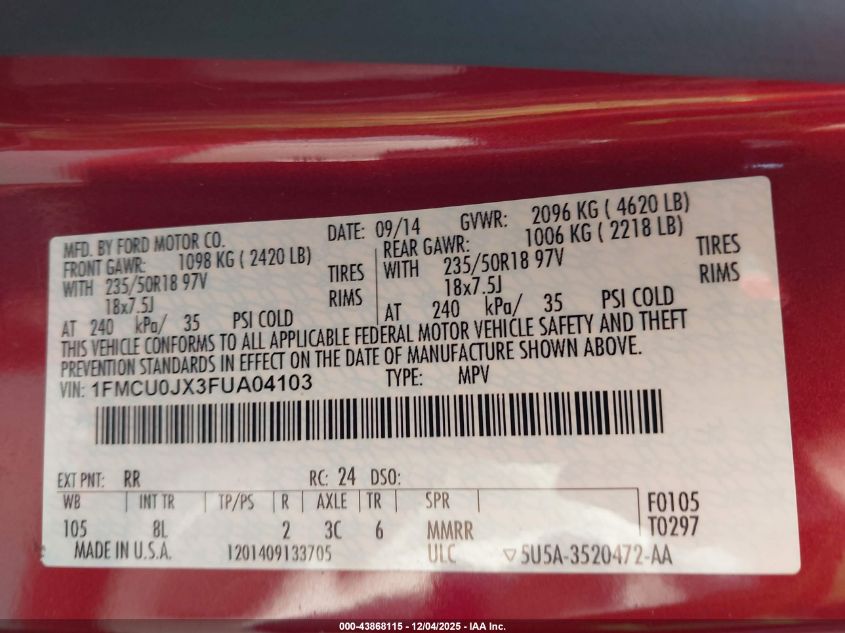 Цвет КрасныйЦилиндры 4Привод Передний приводVIN 1FMCU0JX3FUA04103Состояние Заводится и едет (проверено)Повреждения Левая сторона AutoRIA