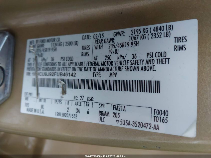 2015 FORD ESCAPE 2015 року Бензин, 2.0, Полный привод, vin - 1FMCU9J92FUB46142 из США