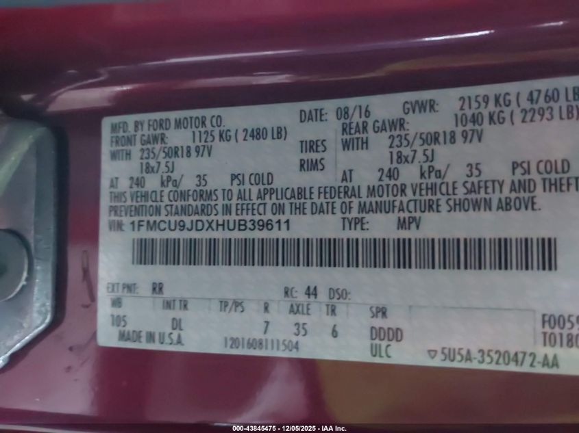 2017 FORD ESCAPE 2017 року Бензин, 1.5, Полный привод, vin - 1FMCU9JDXHUB39611 из США