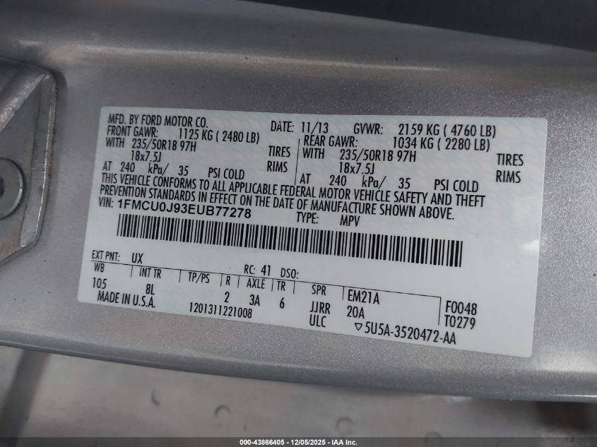 2014 FORD ESCAPE 2014 року Бензин, 2.0, Передний привод, vin - 1FMCU0J93EUB77278 из США